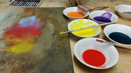 Wir spannen Leinwand auf Keilrahmen, mischen Gouache Farben und Binder an und gestalten Bilder je nach Thema (oder freier Wahl) mit wertvollen Pigmenten und natürlichen Materialien.